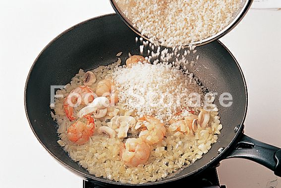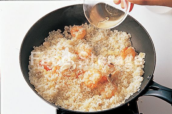 えびの色が変わったら塩、こしょうをふり、米を加えて炒め合わせる。 |