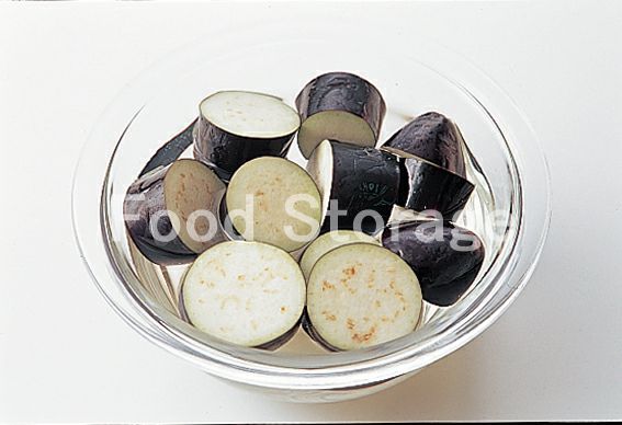 なすは1.5cm厚さの輪切りにし、水に浸けてアク抜きする。 |