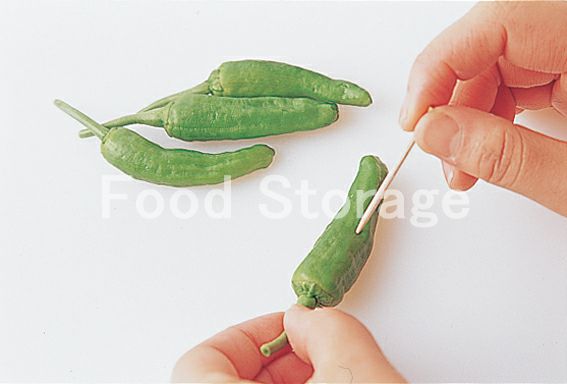 ししとうは楊枝で数ヶ所刺して穴をあける。 |