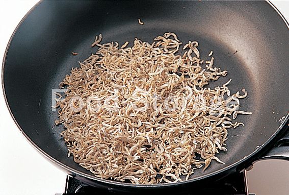 ちりめんじゃこはフライパンでから炒りし、カリカリにして取り出しておく。 |