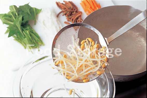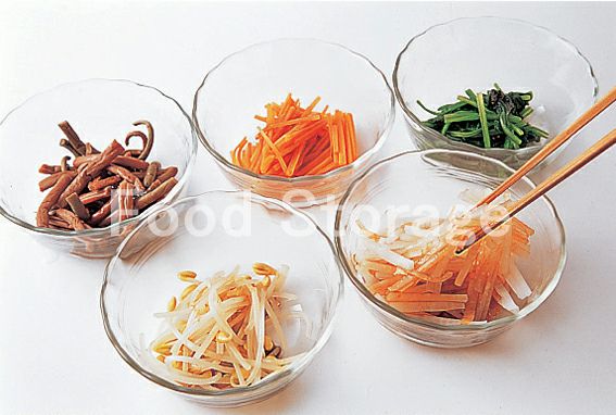 鍋に湯を沸かし、もやし、大根、にんじん、ほうれん草、ぜんまいの順にそれぞれ、さっとゆでて水にとり、水けをしぼる。 |