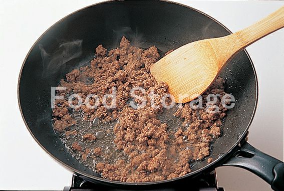 フライパンにサラダ油を熱して合びき肉を入れ、色が変わって汁気がとぶまで数分炒める。 |