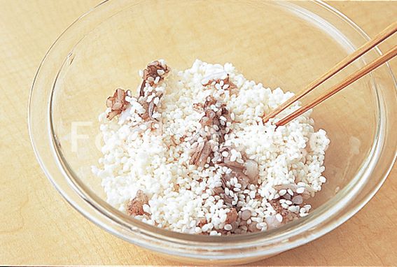 もち米の水けをきり、1の足を加えて混ぜ合わせる。 |