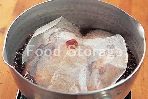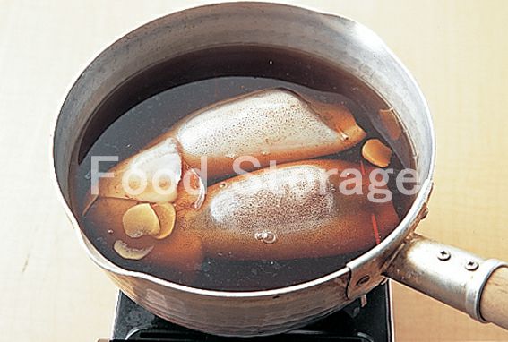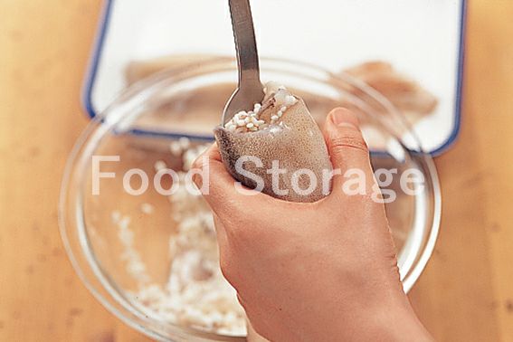 いかの胴の中に2を六分目くらいまで詰める。中身が出ないように、詰め口を楊枝で止める。 |