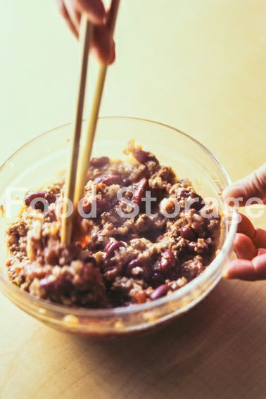 耐熱ボウルに牛ひき肉、1、2、ホールトマト、顆粒スープの素を入れてよく混ぜ合わせる。 |