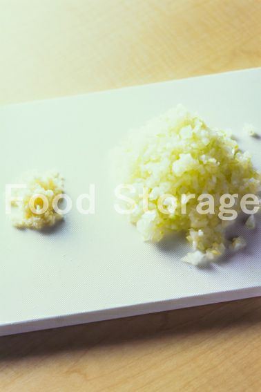 玉ねぎ、にんにくはみじん切りにする。 |