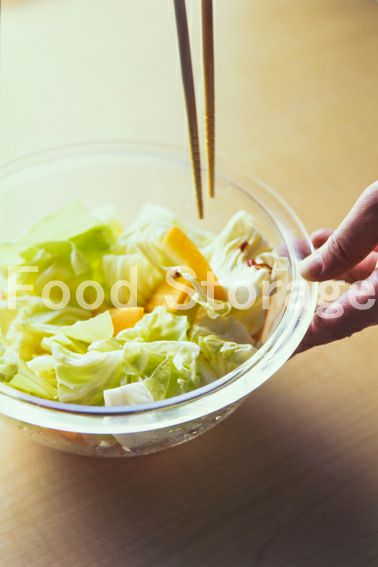 キャベツはざく切り、にんじんは短冊切りにする。 |