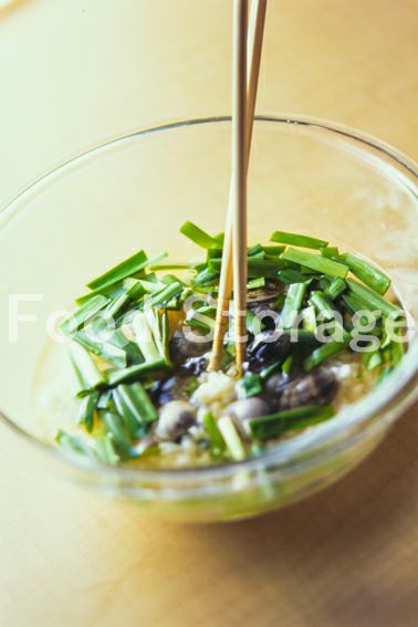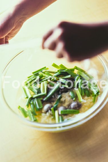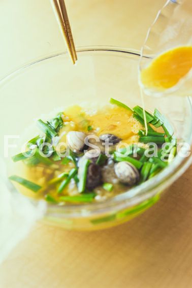 あさり(殻つき) にら ごはん A(だし汁 薄口しょうゆ) 塩 溶き卵
