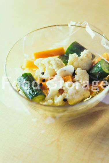 | 歯ごたえのある野菜たちをあっという間にピクルスに。大きめのボウルでまとめて作って保存して。 |