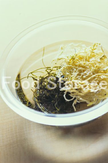 耐熱ボウルに水をはり、切り干し大根、刻み昆布を加えて電子レンジ(600W)で2分加熱する。