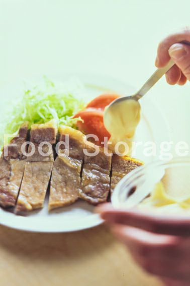豚ロース肉 塩 a(しょうがの絞り汁 しょうゆ みりん) キャベツ トマト マヨネーズ・七味唐辛子