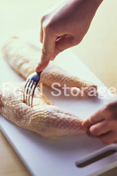 鶏もも肉は皮にフォークで数箇所穴を開ける。 |