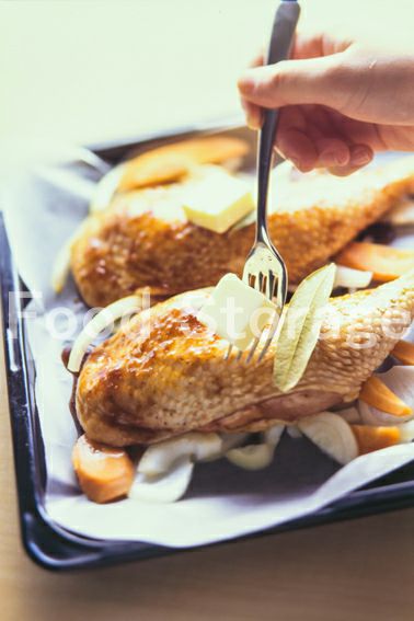 8を取り出し、肉汁をローストチキンに塗って器に盛り、グリーンカール、プチトマトを添える。 |