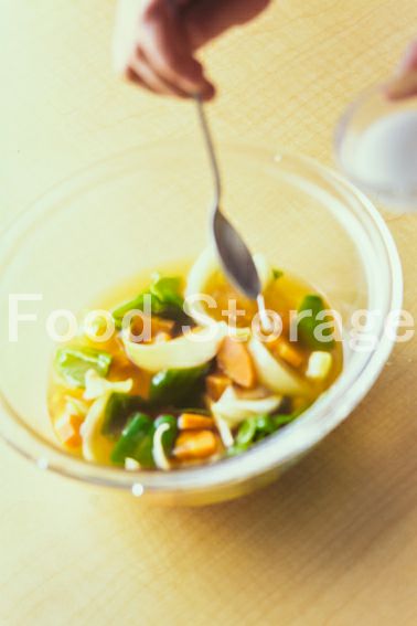 玉ねぎはくし形、にんじんはいちょう切り、ピーマンは乱切りにする。 |