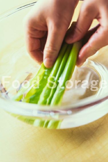 チンゲン菜は根を切り落とし、水にくぐらせてからラップで包み、電子レンジ(600W)で1分加熱する。 |