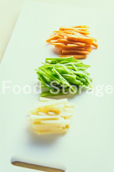 ピーマン、たけのこ水煮、にんじんは細切りにする。もやしはひげ根を取り除き、しいたけは薄切りにする。 |