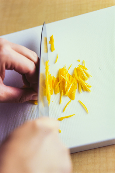 オレンジの皮は表面を薄くそぎ、細切りにする。