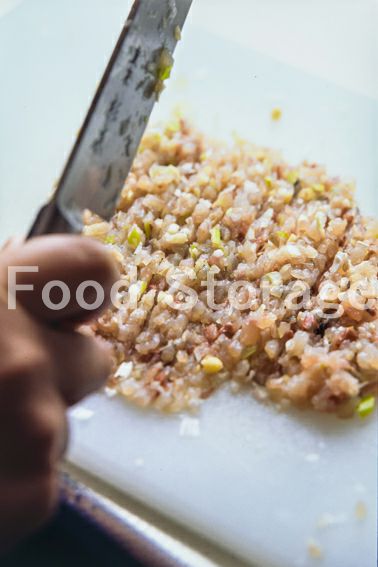 2を合わせて包丁で細かくなるまでよくたたく。 |