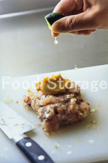 細かくなったらみそ、すだちの絞り汁を混ぜ合わせ、さらにたたく。 |