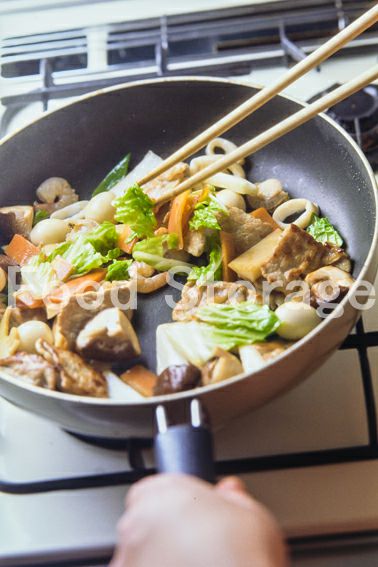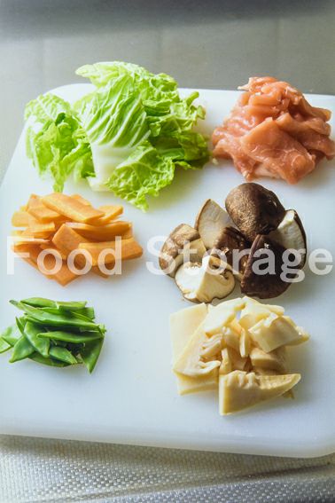 豚肉は3cm幅に切り、aで下味をつける。冷凍シーフードミックスは熱湯でさっとゆでる。白菜はざく切り、にんじん、ゆでたけのこは短冊切り、絹さやは筋を取り除いて斜め半分に切り、しいたけは石づきを切り落として4等分に切る。 |