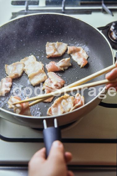 フライパンにサラダ油を熱し、1の豚肉を炒める。 |