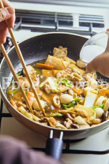 3に鶏がらスープを加えて煮、野菜がやわらかくなったら、bで味をととのえ、水溶き片栗粉でとろみをつけ、仕上げにごま油をたらす。 |