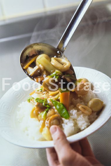 | 魚介類、肉、野菜などの旨みがたっぷり詰まった中華丼。スープで煮込んだ具材にとろみをつけて、それを丸ごとごはんにかけていただきます。 |