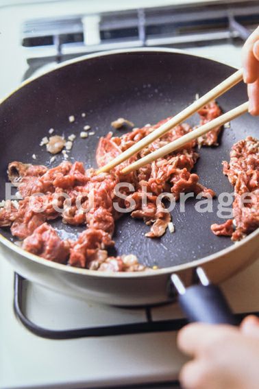 フライパンにサラダ油大さじ2、2のにんにくを入れて火にかけ、じっくりと弱火で香りが出るまで炒め、2の牛肉をこんがりと焼いて取り出しておく。 |