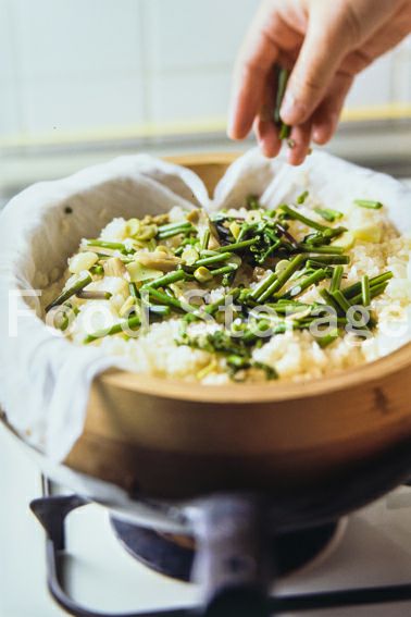 3を再び蒸籠に戻し、水気をきった山菜水煮をのせてさらに20分程蒸す。 |