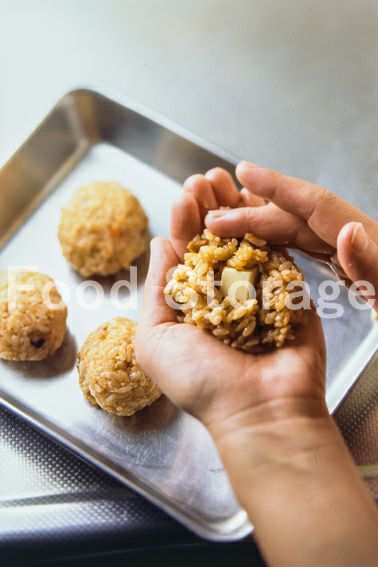 チキンライスは12等分にし、1を中央にのせてボール型に丸める。