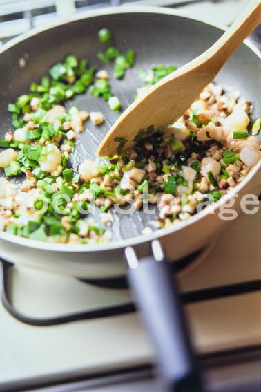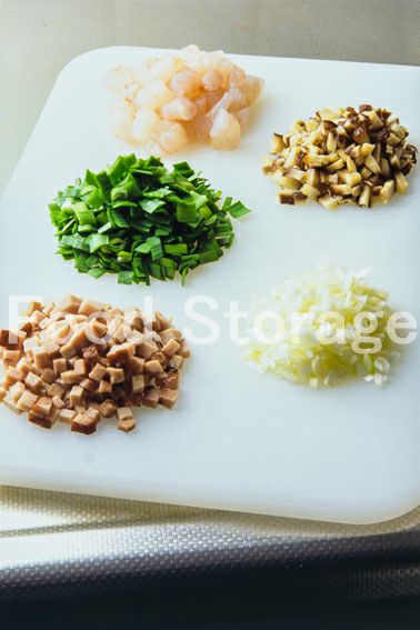 チャーシューは5mm角に切り、むきえびは背わたを取り除き4等分に切る。干ししいたけは水につけて戻し、石づきを切り落として5mm角に切り、にらは小口切りにする。 |