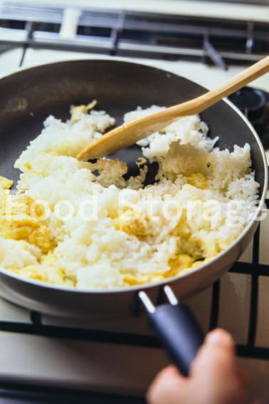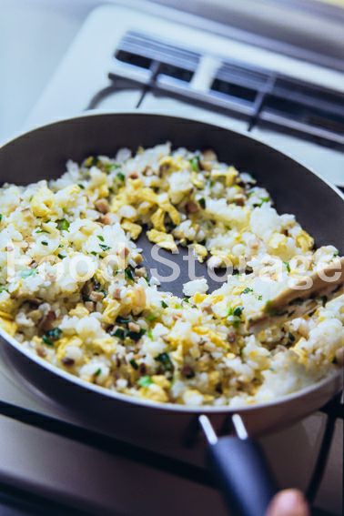 よくかき混ぜながら半熟の状態になったらごはんを加えて手早く炒め合わせる。 |
