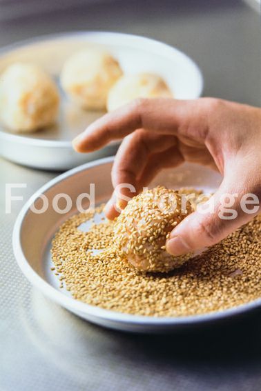 8の表面に7の白ごまをたっぷりまぶし、形をととのえる。 |