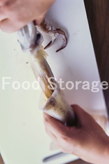 するめいかはわたを取り除き、足は2本ずつに切る。胴は2cm幅に切り込みを入れる。