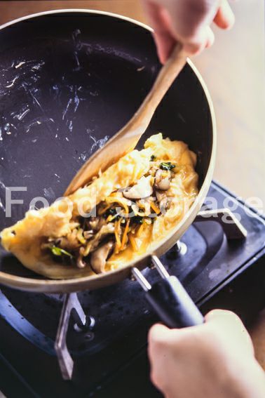 器に3を崩れないように盛る。 *オムレツは1人分ずつ作っても、4人分を1個の大きなオムレツにしてもよい。 |
