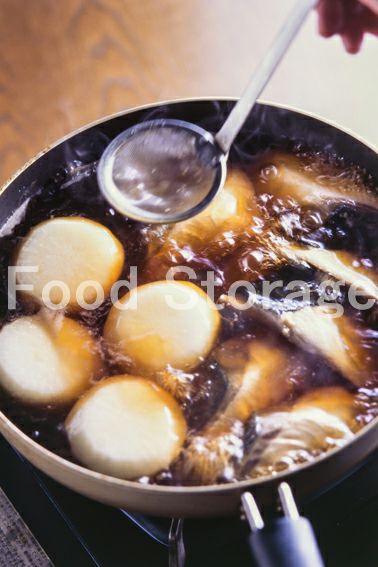 鍋に1、2、aの煮汁を入れて強火にかける。煮汁を煮立ててから入れるのではなく、一緒に入れて煮立てます。