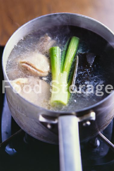 鍋に水7カップ(分量外)、さっと洗っただし昆布、鶏骨つき肉、長ねぎの青い部分を入れて火にかける。 |