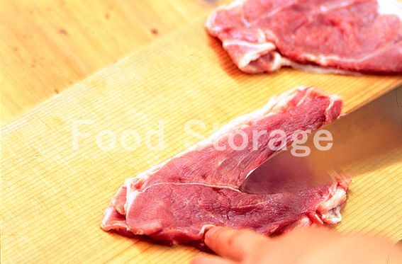 豚肉は数枚重ねて包丁を入れ、赤身と白い脂との間にある筋を切っておく。キャベツはせん切りにし、水にさらす。 |