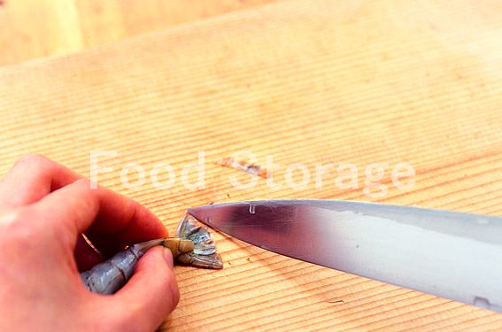 えびは、背わたと殻を取り除き、腹に切り込みを入れ、反らして筋を切る。さらに油がはねないように、尾の先を切って包丁の背で水をしごき出したら、酒をふっておく。 |