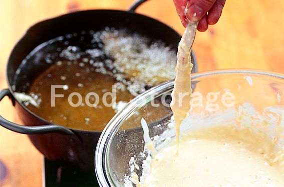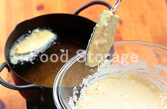 水けをふいた1、2、大葉にそれぞれ薄く薄力粉をまぶし、ひとつずつ4の衣にくぐらせて、170〜180℃に熱した揚げ油に、野菜から順に入れて、カラッと揚げる。 |
