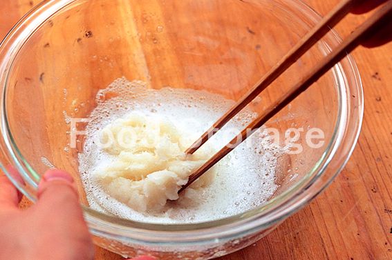 ボウルに卵白を入れて軽く泡立て、2のかぶ、塩を加えて混ぜ合わせる。 |