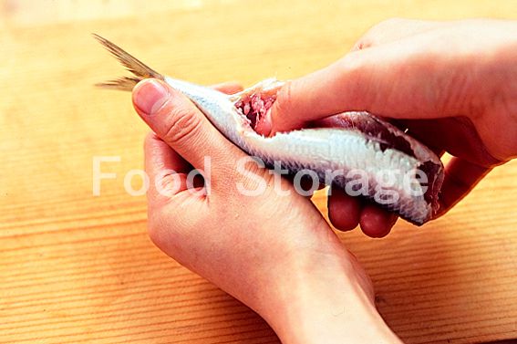いわしは包丁でしごいてうろこを取り、頭、腹わたを取り除き、ボウルに張った水できれいに洗って、しっかりと水けを拭き取る。 |