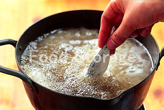 1のあじに薄力粉をまぶして、余分な粉を落とし、160℃に熱した油でじっくりと揚げ、最後に温度を高くしてカラッと揚げる。 |