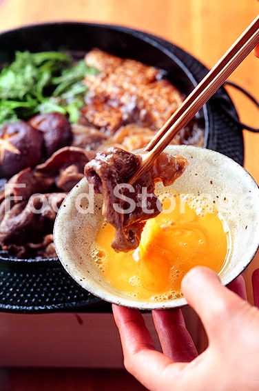 牛薄切り肉 白菜 春菊 長ねぎ しいたけ 焼き豆腐 糸こんにゃく 牛脂 A(酒 砂糖 だし汁 しょうゆ) 卵