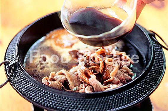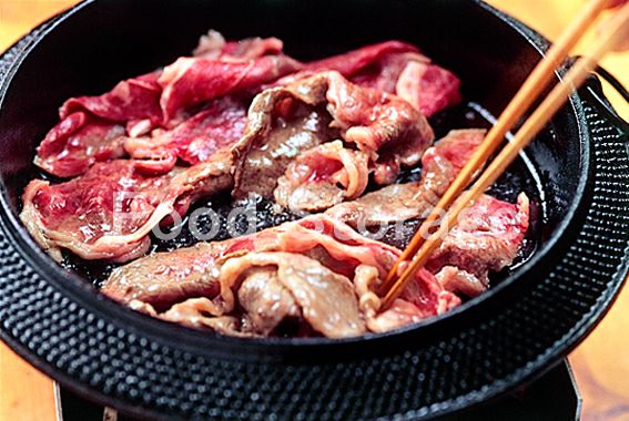 熱した鍋に牛脂を溶かし、牛肉を広げて入れ、強火でさっと焼く。 |