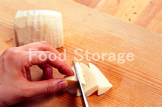 たけのこの穂先5cmは縦に5mm厚さの薄切りにし、残りは5mm厚さのいちょう切りにする。 |