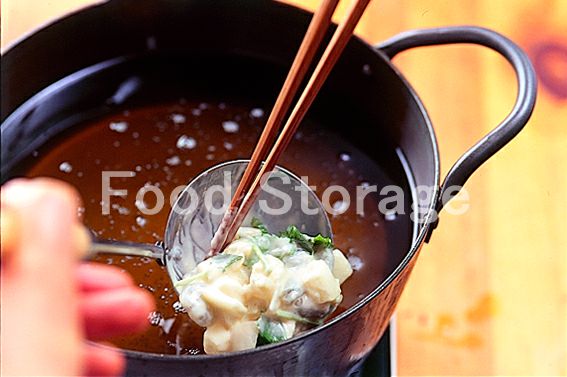 170℃に熱した揚げ油に、3をお玉ですくってすべらせるように入れ、カラッと揚げる。油をきって器に盛り、塩をつけていただく。 |