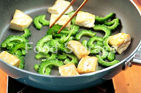 フライパンにサラダ油を熱し、2を炒めて焼き色をつける。水気をきったにがうり、もやしの順に加えて炒める。 |