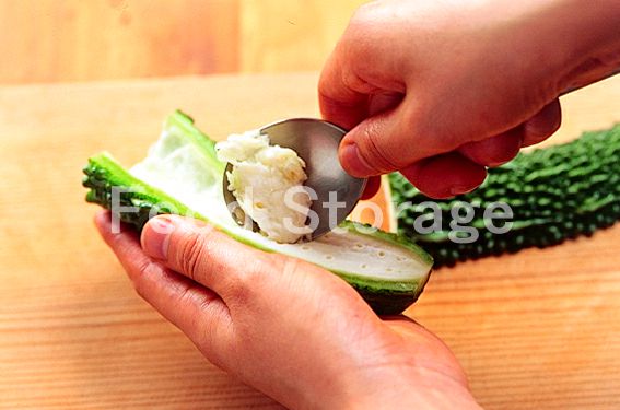 にがうりは縦半分に切って種とわたを取り、2〜3㎜厚さの薄切りにする。塩をふってしばらくおき、しんなりしたらさっと洗う。 |