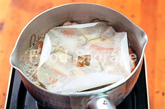切り昆布を戻し汁ごと鍋に入れて強火にかけ、沸騰したらさつま揚げ、砂糖、酒を加えて落としぶたをし、中火で5分ほど煮る。 |